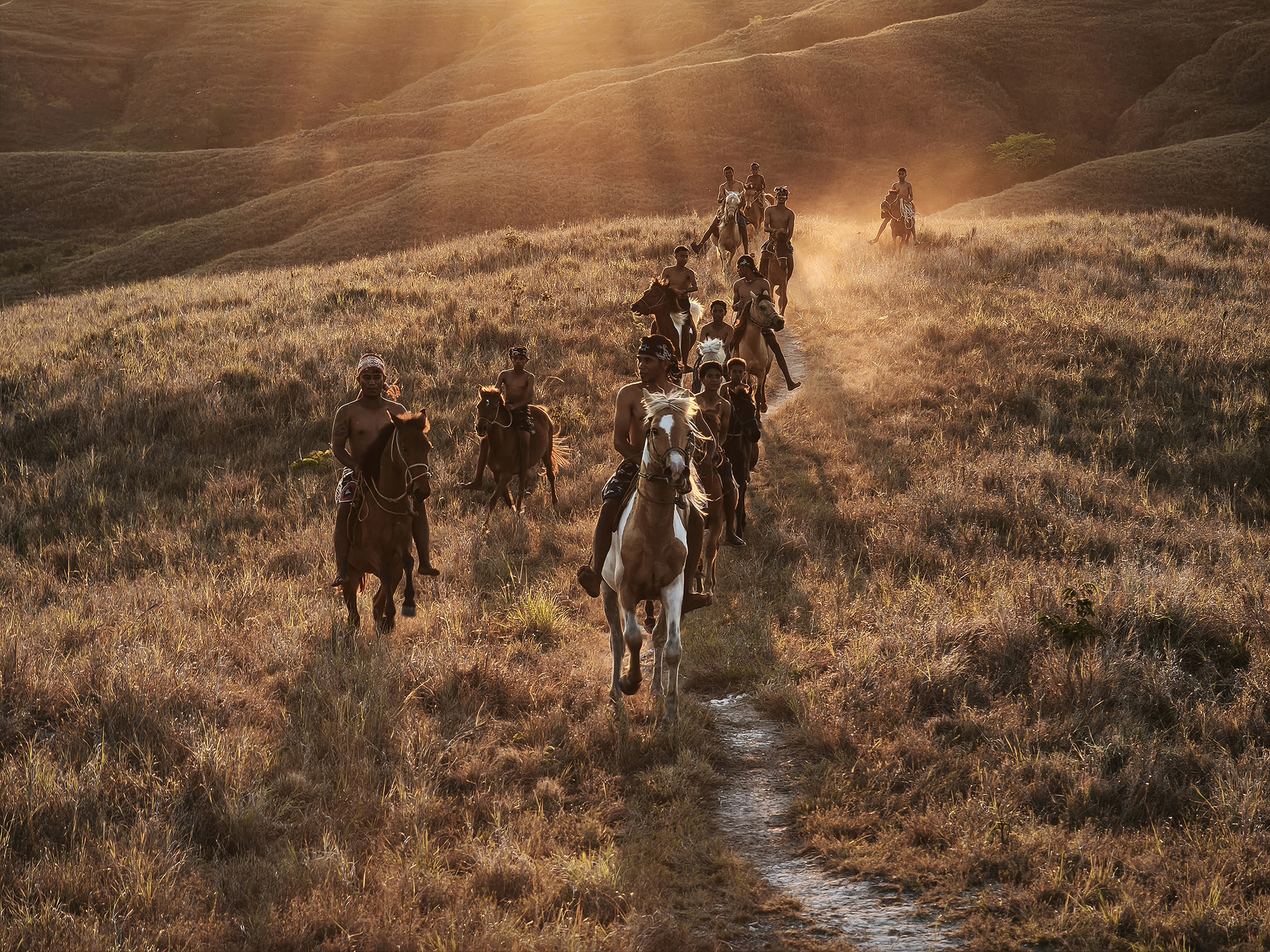 Day 6 (Mar 1): The Road to East Sumba We embark on a scenic 6-hour cross-island journey, transitioning from the rugged west to the rolling savannahs of the east. This drive offers a glimpse into the changing topography and rural life of the island. Afternoon: Wairinding Hills. Private setup with 10–15 horsemen on the ridgelines. Sunset: Silhouette shoot. We capture the horsemen against the “chocolate hills,” so named for the deep brown hue the grass takes during the dry season. Overnight: Waingapu.