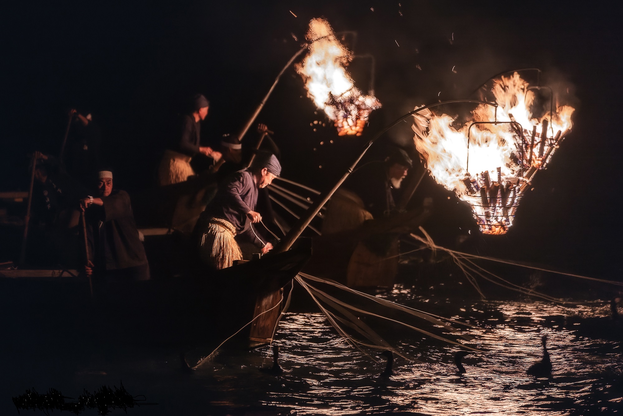 DAY 6: Mino – Seki – Mino After a beautiful Japanese-style breakfast served at our hotel, we will drive up one of the quiet valleys to visit with a washi paper maker who still adheres to traditional styles of hand making paper while creating contemporary masterpieces. After photographing him at work in his studio space, we’ll having a special lunch served on premises. After lunch, we will drive south to Seki, one of Japan’s most famous centers for steel forging in Japan (traditionally samurai swords, but these days also kitchen knives, pruning shears, and scissors). Here, we ‘ll have a private photography session at a samurai swordsmith forge, where master craftsmen still wear traditional garb. We will have an early dinner (Seki is home to the best barbecued unagi–eel)–in Japan), which facilitates another cultural highlight: nighttime cormorant fishing in ancient tradition–a scene that unfolds like an ancient Japanese picture scroll in which fishing masters use tethered cormorants to catch sweetfish in the dark of night using flaming lanterns at the prow of their boats. Our boats will travel down the river together, in parallel to the fishing boat. This is the real deal and authentic as it has been for over a thousand years – no setups for tourists. Overnight: Mino
